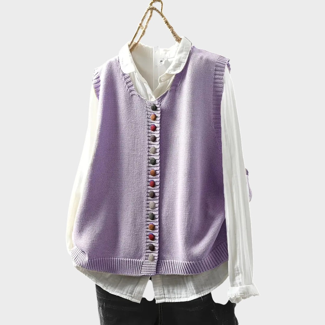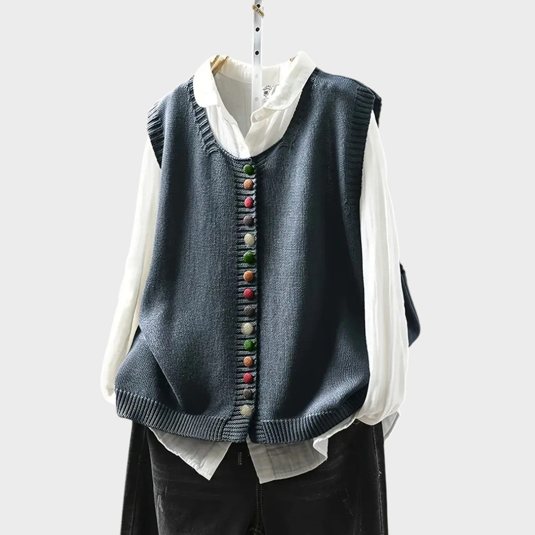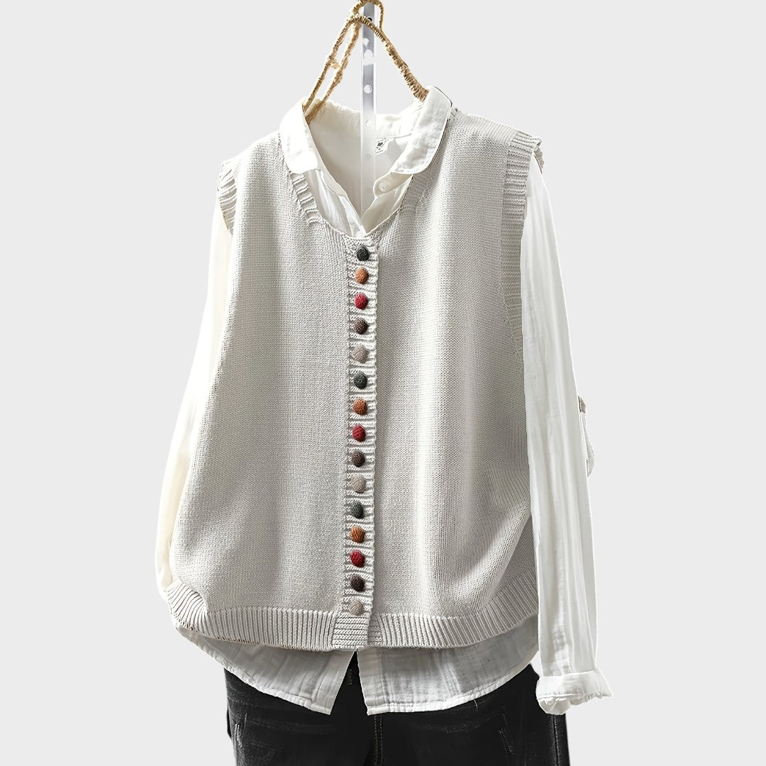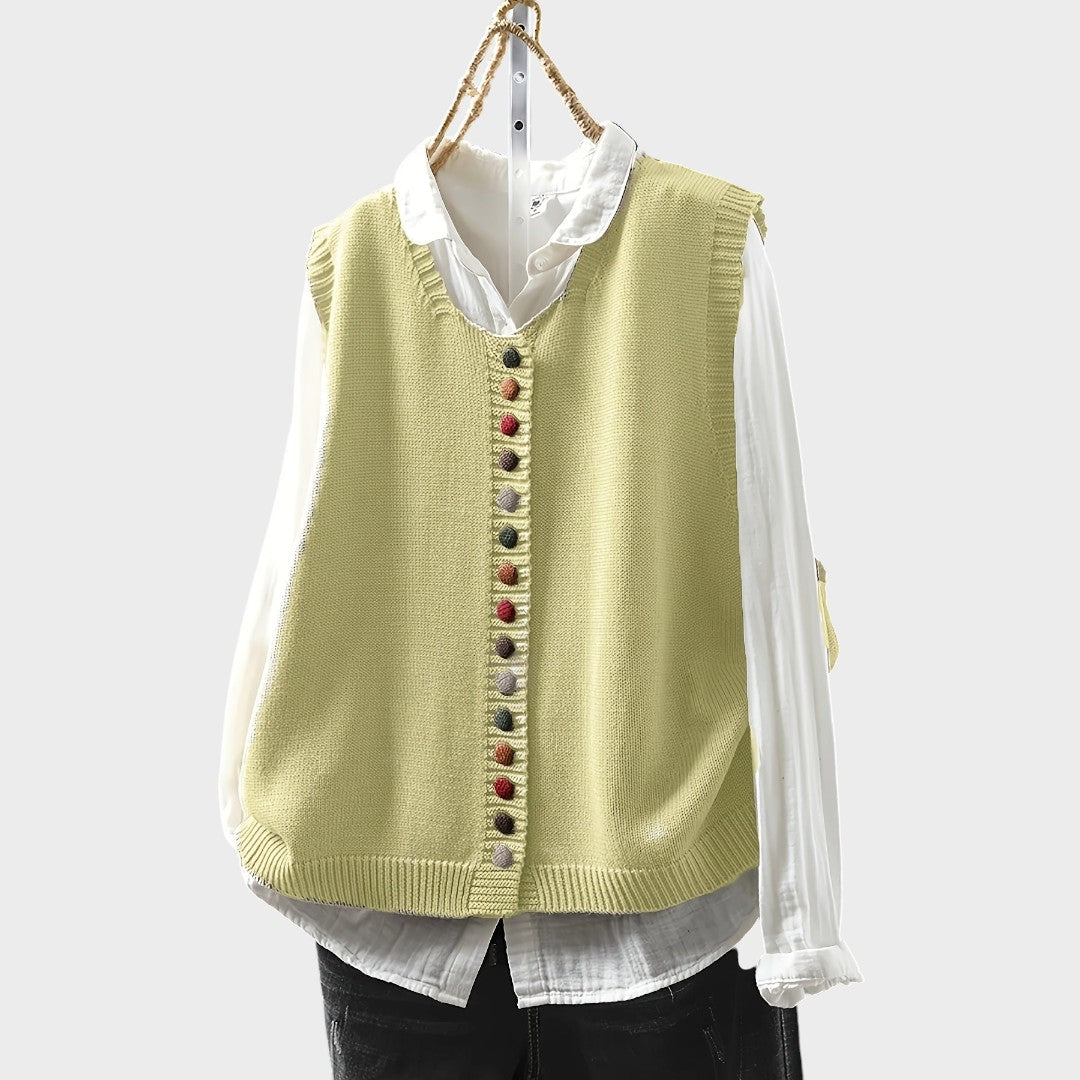 Este colete de malha é a peça perfeita para dar um toque criativo e aconchegante a qualquer look. O detalhe dos botões coloridos acrescenta personalidade e leveza, tornando-o ideal para conjugar com camisas, blusas ou até vestidos.