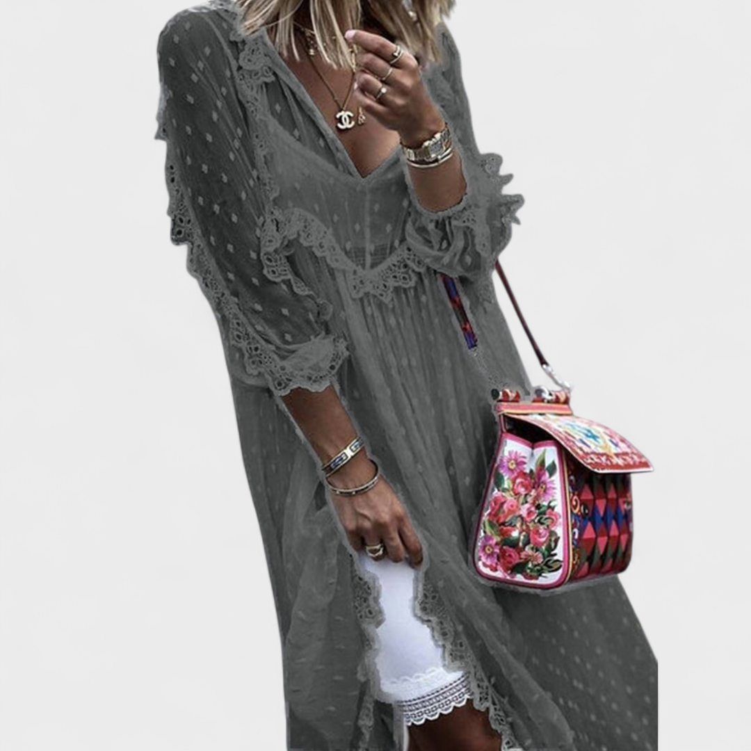 Um vestido leve e delicado que mistura transparência, rendas e detalhes em padrão poá, criando um visual cheio de feminilidade e sofisticação. O corte fluído com acabamento rendado transmite charme e elegância, perfeito para quem procura uma peça única que se destaca pela leveza e romantismo.