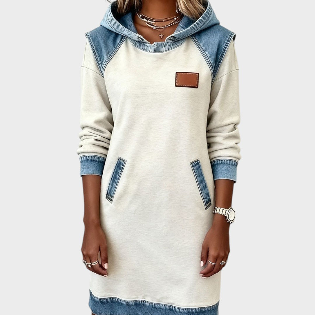Este vestido casual com capuz combina o melhor dos dois mundos: conforto descontraído e estilo urbano. O seu corte moderno e detalhes contrastantes criam um visual cheio de personalidade, ideal para quem gosta de se sentir bem e elegante sem esforço.