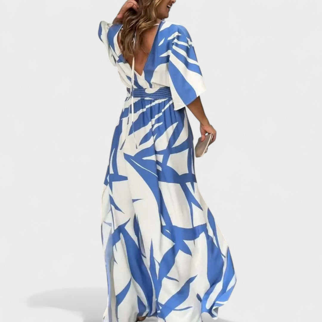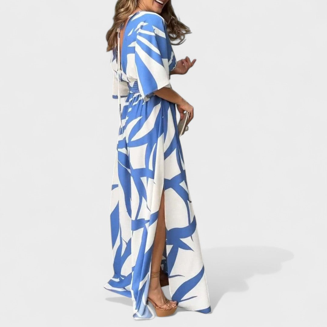 Este vestido longo, com decote cruzado e mangas amplas, é a escolha certa para quem quer estar elegante sem abrir mão do conforto. O padrão expressivo e o corte fluido criam um visual leve e impactante. A cintura marcada valoriza a silhueta e proporciona um caimento impecável.